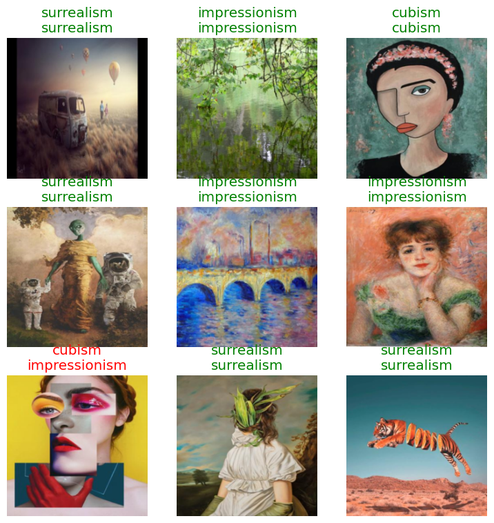 Even though it is not perfect we can see that most of the predictions are correct! This is impressive as I was not sure that the model would be able to pick up on the difference between painting types given the limited input data and number of epochs.